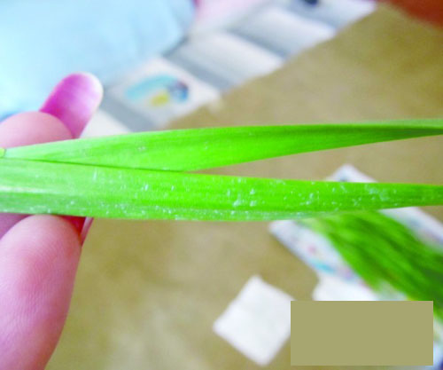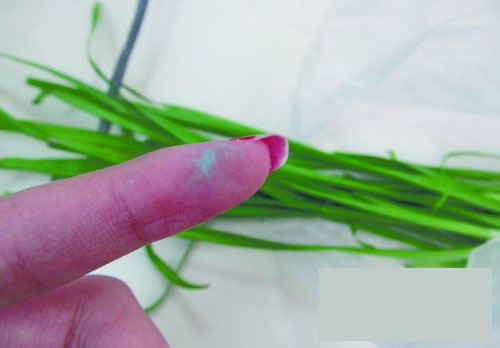 拿起韭菜仔細觀察發現,韭菜葉上面布滿了藍白色的斑點,在靠近根部的位置尤其明顯。用手將一根韭菜從頭擼到尾,手指頭就變成了藍色,湊近鼻子一聞,一股銅銹的味道鉆進鼻孔。